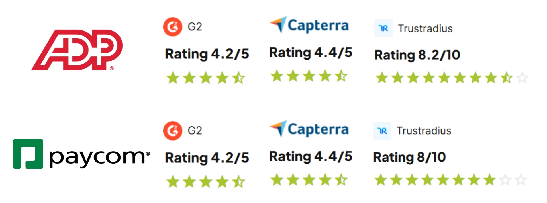 Volume of reviews favors ADP; user satisfaction scores are comparable.