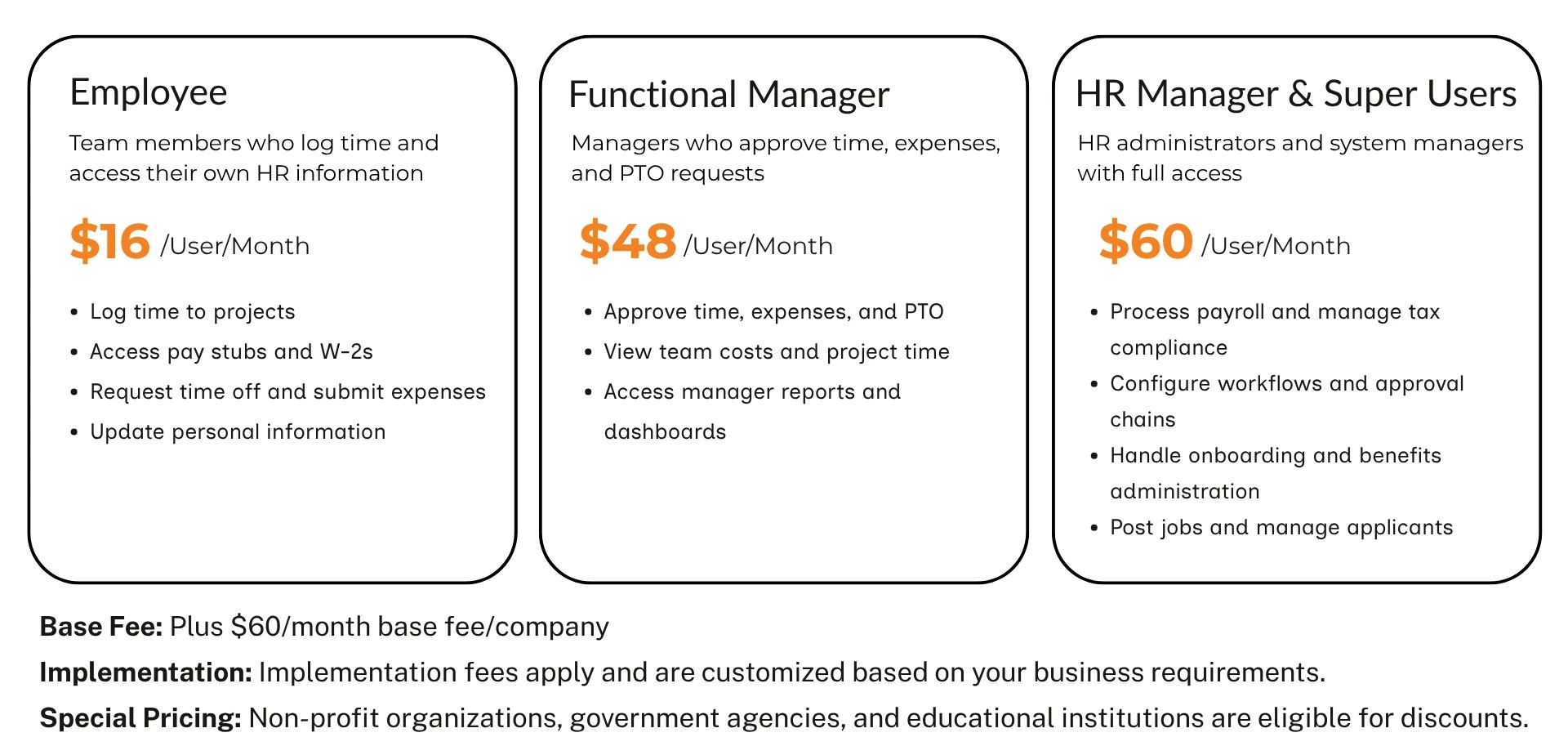 A: No for Paycom and Paylocity. Neither publishes official pricing publicly. Industry estimates exist ($25-36 PEPM for Paycom, $22-32 PEPM for Paylocity) but your actual cost depends on company size, modules selected, and negotiation. Sunrise HCM provides transparent pricing: $16 per employee, $45 per functional manager, $60 per HR Manager, plus $60 base fee monthly.